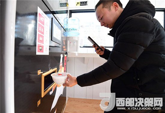 在位于西安曲江創(chuàng)客大街邊的一家無人面館內(nèi),市民用手機拍攝機器剛做好的面食(1月10日攝)。新華社記者 邵瑞 攝