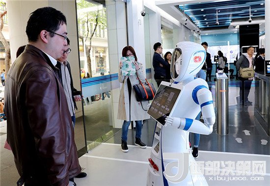 一位市民在位于上海九江路的無人銀行入口處向迎賓機器人說明需要辦理的業(yè)務(wù)種類(4月12日攝)。近日,中國建設(shè)銀行在上海九江路開出國內(nèi)首家無人銀行。新華社記者 方喆 攝