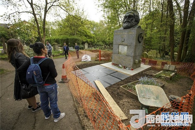 歷史長河奔流不息,真理之光穿越時空。1818年5月5日,德國小城特里爾,一代偉人馬克思誕生。200年后,世界東方。高擎馬克思主義的精神火炬,在習(xí)近平新時代中國特色社會主義思想指引下,中國共產(chǎn)黨正領(lǐng)導(dǎo)億萬人民書寫人類發(fā)展史上新的奇跡。這是2018年5月3日,在英國倫敦北部海格特公墓,人們來到正在進行維修的馬克思墓前參觀。新華社發(fā)(蒂姆·愛爾蘭攝)