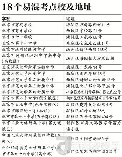 北京教育考試院公布了18個容易混淆名稱或走錯校區(qū)的考點(diǎn)名單,共涉及4類。第一類是考點(diǎn)的名稱相似、只有一字之差的考點(diǎn),比如北京市育才學(xué)校與北京市育英學(xué)校,北京市十一學(xué)校與北京市第十一中學(xué),北京市通州區(qū)潞河中學(xué)與北京市通州區(qū)運(yùn)河中學(xué)。