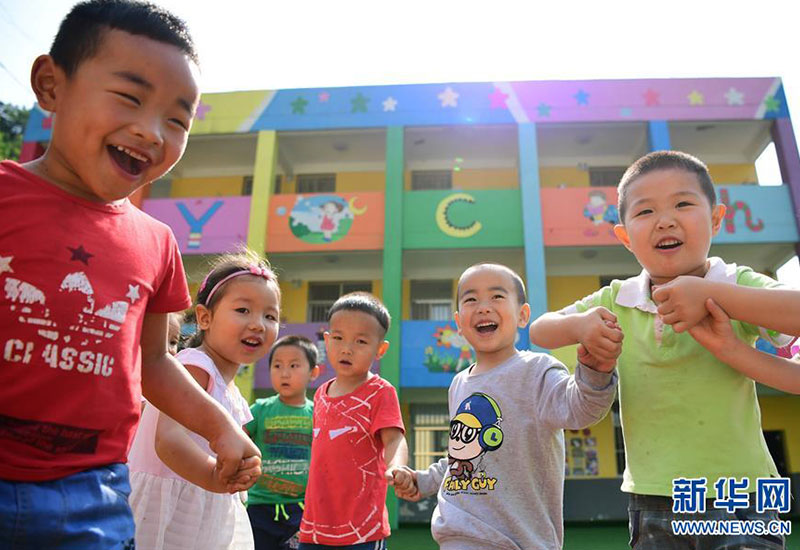 陜西省安康市漢濱區(qū)雙龍鎮(zhèn)杜壩村五四小學(xué)附設(shè)幼兒園小朋友們?cè)诓賵?chǎng)上做游戲(2017年6月16日攝)。這個(gè)幼兒園使用貸款資金翻修改造而成,有效解決了該村及周邊兒童學(xué)前教育缺失的問題。新華社記者 邵瑞 攝