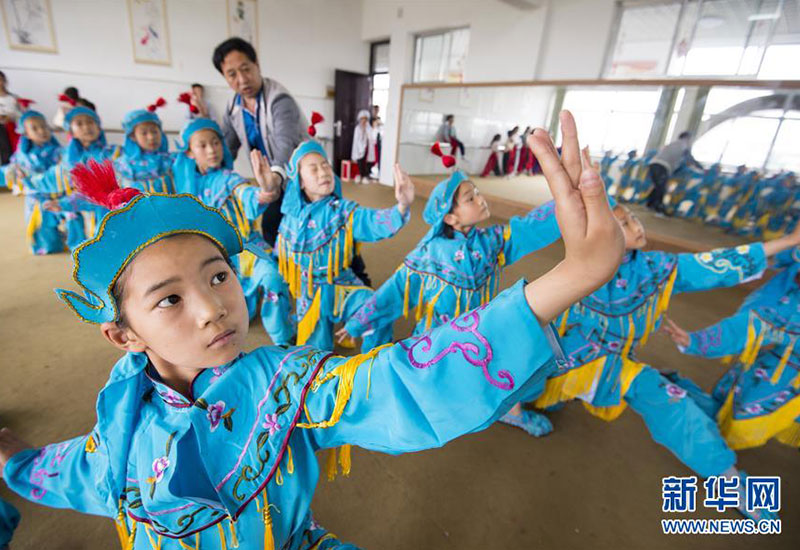 江蘇省南通市海安縣西場(chǎng)小學(xué)學(xué)生在練習(xí)京劇(5月26日攝)。新華社發(fā)(徐勁柏 攝)