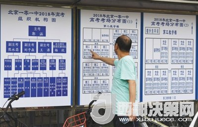 6月6日,考生家長(zhǎng)在101中學(xué)校外觀看考場(chǎng)分布圖。