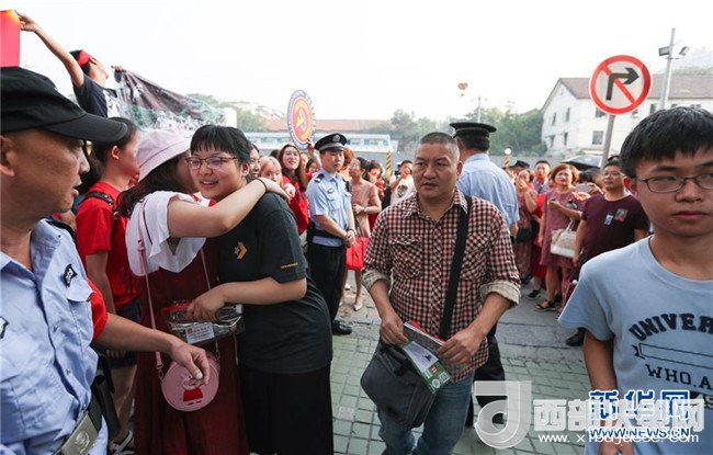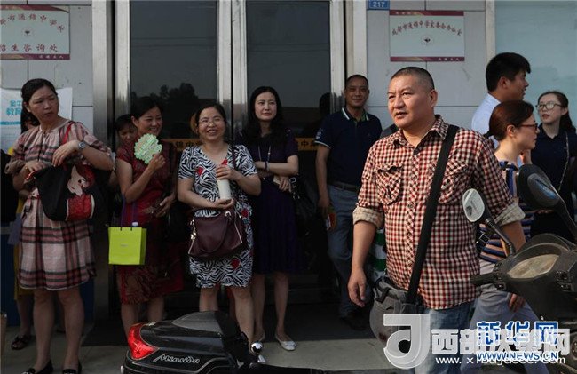 6月7日,在2018年高考成都通錦中學(xué)考點(diǎn),梁實(shí)(前右)吸引考生家長(zhǎng)的目光。新華社記者 江宏景攝