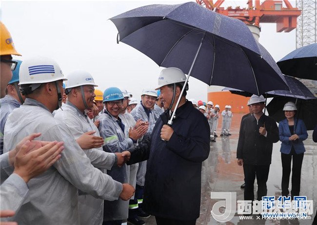 風(fēng)急云低,雨流如注。13日下午,習(xí)近平來到中集來福士海洋工程有限公司煙臺(tái)基地。作為國內(nèi)率先進(jìn)入海洋工程行業(yè)的企業(yè),中集來福士用10年左右時(shí)間,國產(chǎn)化率從不足10%提高到60%。在廠區(qū)碼頭上,習(xí)近平撐著雨傘,趟著積水,近距離察看??吭谶@里的自升式修井生活平臺(tái),遠(yuǎn)眺“藍(lán)鯨1號”超深水雙鉆塔半潛式鉆井平臺(tái)、“泰山”龍門吊、海洋牧場平臺(tái),向企業(yè)負(fù)責(zé)人詳細(xì)了解高端海洋工程設(shè)備制造、維護(hù)、運(yùn)行情況。海風(fēng)吹起了衣襟,雨水打濕了褲腿。習(xí)近平站在雨中,同圍攏過來的工人們一一握手、親切交談,向作業(yè)平臺(tái)上的工人們揮手致意。習(xí)近平指出,國有企業(yè)特別是中央所屬國有企業(yè),一定要加強(qiáng)自主創(chuàng)新能力,研發(fā)和掌握更多的國之重器。國有企業(yè)要深化改革創(chuàng)新,努力建成現(xiàn)代企業(yè)。要堅(jiān)持黨對國有企業(yè)的領(lǐng)導(dǎo)不動(dòng)搖,堅(jiān)持建強(qiáng)國有企業(yè)基層黨組織不放松,為做強(qiáng)做優(yōu)做大國有企業(yè)提供堅(jiān)強(qiáng)組織保證。