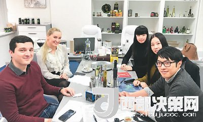 就讀于捷克布拉格經(jīng)濟(jì)大學(xué)的趙韞如(右后三)和朋友在一起討論相關(guān)課題。
