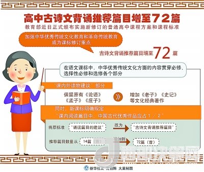 其中,語文課標最突出,中華優(yōu)秀傳統(tǒng)文化方面的內(nèi)容貫穿必修、選擇性必修和選修各個部分。一是內(nèi)容更全,在“課內(nèi)外讀物建議”部分,除保留原有《論語》《孟子》《莊子》外,增加了《老子》《史記》等文化經(jīng)典著作,要求學生廣泛閱讀各類古詩文,覆蓋先秦到清末各個時期。二是分量更多,課程標準明確規(guī)定“課內(nèi)閱讀篇目中,中國古代優(yōu)秀作品應占1/2”。三是要求更高,在全面加強的同時,還設置中華優(yōu)秀傳統(tǒng)文化學習專題,進行中華傳統(tǒng)文化經(jīng)典作品深入學習研討。將原標準“誦讀篇目的建議”改為“古詩文背誦推薦篇目”,推薦篇目數(shù)量也從14篇(首)增加到72篇(首),提高了學習要求。