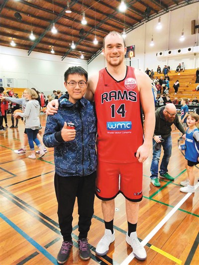 圖為吳宇森在新西蘭球館觀(guān)看籃球賽時(shí)和球員合影留念。