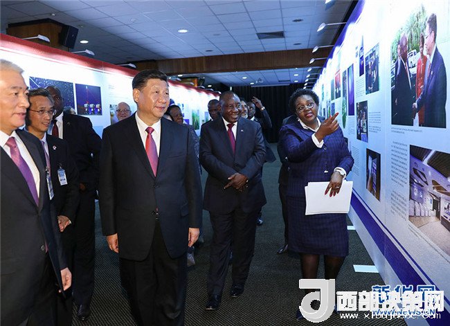 兩國元首共同前往展覽廳,依次觀看展示非洲科技旗艦項目、南非科技成就、中國科技成就、中南科技合作成果的圖片。南非平方公里陣列射電望遠鏡是包括中國在內多國科學家參與的重點項目,也是中南重點科技合作項目,兩國元首仔細聽取有關介紹,并勉勵雙方科學家繼續(xù)努力,把項目建設好。參觀后,兩國元首出席北汽投資項目首輛汽車下線視頻連線儀式。