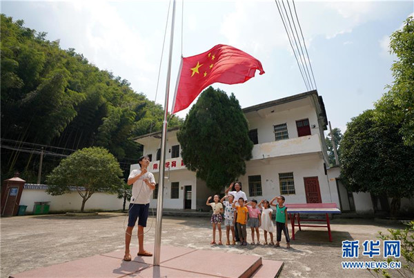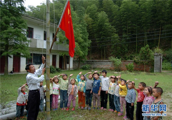 9月4日,在蘆嶺教學(xué)點(diǎn),陳云根(后)和黃文春(前)帶著全校6名學(xué)生升國旗。現(xiàn)在學(xué)校操場已經(jīng)鋪上了水泥。新華社記者 宋振平 攝
