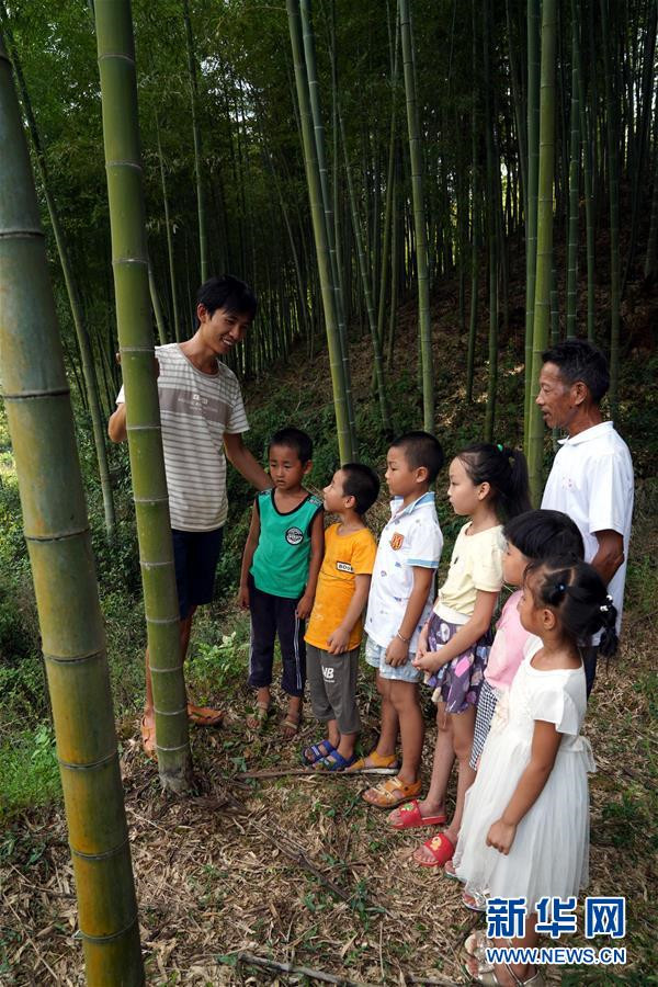 9月4日,黃文春(左一)和陳云根帶著學(xué)生們來到學(xué)校附近的山林,為孩子們講解竹子的生長過程。 新華社記者 汪明麗 攝