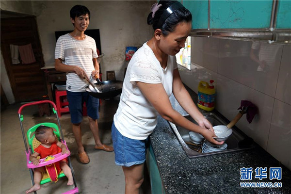 9月4日,在黃文春家中,黃文春和妻子歐陽沙在廚房做飯。黃文春2011年與同學(xué)歐陽沙結(jié)婚后,就把根扎在了蘆嶺,幾次放棄了考試進(jìn)城教書的機(jī)會。 新華社記者 宋振平 攝