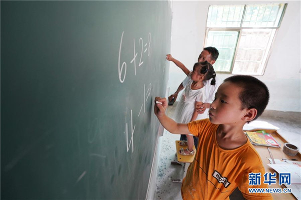 9月4日,在蘆嶺教學(xué)點(diǎn),陳云根在課堂上帶著孩子們做習(xí)題。 新華社記者 宋振平 攝