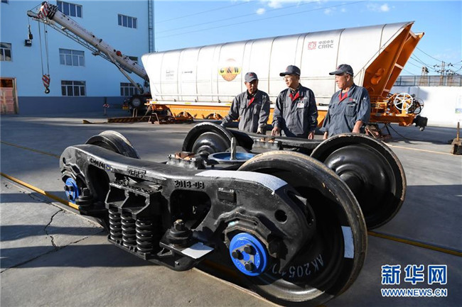 中車齊車集團有限公司教授級高工李向偉(中)介紹企業(yè)生產(chǎn)的重載技術領先的中交叉轉(zhuǎn)向架(9月26日攝)。 新華社記者王建威攝