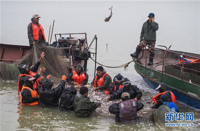 在吉林省松原市查干湖,漁民進行捕撈作業(yè)(9月28日攝)。新華社記者許暢攝