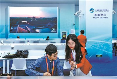 11月4日,首屆中國國際進(jìn)口博覽會(huì)進(jìn)入1天倒計(jì)時(shí)。來自復(fù)旦大學(xué)、上海交通大學(xué)等34所上海高校的5200多名大學(xué)生志愿者,成為進(jìn)博會(huì)志愿者隊(duì)伍的主力軍。圖為進(jìn)博會(huì)新聞中心的東華大學(xué)志愿者(右)在為記者解答問題。 張勁松 攝