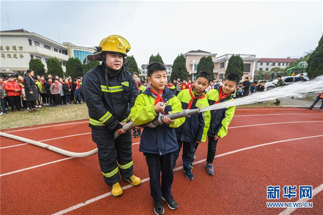 3月6日,東林鎮(zhèn)消防應(yīng)急救援隊(duì)的隊(duì)員帶領(lǐng)小學(xué)生們體驗(yàn)水槍的使用。當(dāng)日,浙江省湖州市吳興區(qū)東林鎮(zhèn)東林小學(xué)舉行“開學(xué)第一課”消防安全進(jìn)校園活動(dòng)。東林鎮(zhèn)消防應(yīng)急救援隊(duì)的隊(duì)員們通過(guò)普及消防安全知識(shí)、應(yīng)急逃生知識(shí)等內(nèi)容,讓學(xué)生們了解日常消防安全常識(shí),增強(qiáng)消防安全意識(shí)。新華社記者 徐昱 攝