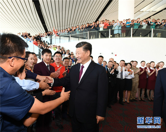 9月25日上午,北京大興國(guó)際機(jī)場(chǎng)投運(yùn)儀式在北京舉行。中共中央總書記、國(guó)家主席、中央軍委主席習(xí)近平出席儀式,宣布機(jī)場(chǎng)正式投運(yùn)并巡覽航站樓。這是習(xí)近平看望參與機(jī)場(chǎng)建設(shè)和運(yùn)營(yíng)的工作人員代表,同他們親切交談。 新華社記者 鞠鵬 攝