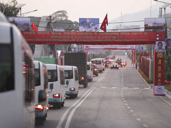 10月12日,尼泊爾首都加德滿都,車隊(duì)經(jīng)過(guò)一道道迎賓拱門(mén)。新華社記者丁林?jǐn)z