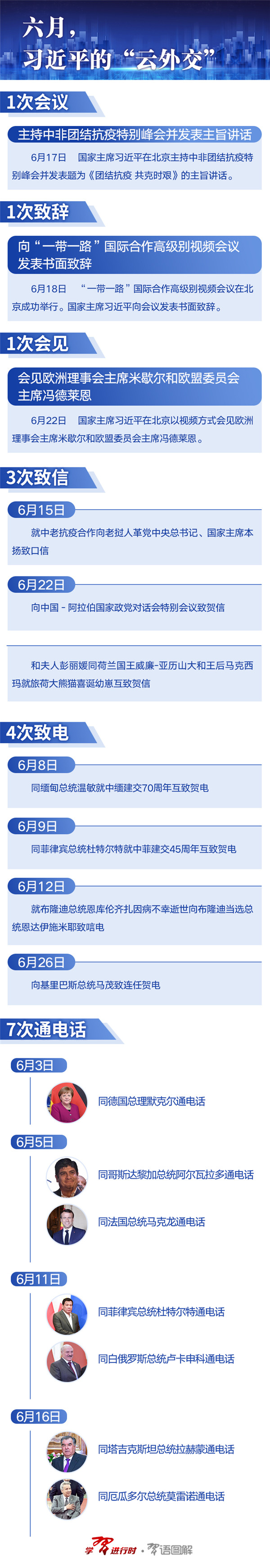 6月,習(xí)近平同德國總理默克爾、法國總統(tǒng)馬克龍、哥斯達黎加總統(tǒng)阿爾瓦拉多等外國領(lǐng)導(dǎo)人通電話;向中國-阿拉伯國家政黨對話會特別會議致賀信;以視頻方式主持中非團結(jié)抗疫特別峰會、會見歐洲理事會主席米歇爾和歐盟委員會主席馮德萊恩……