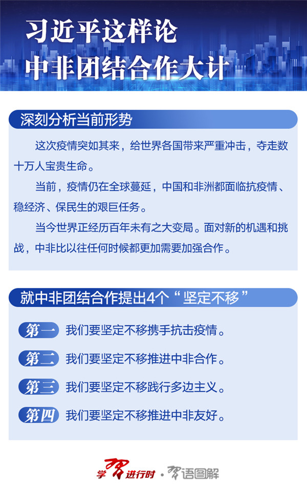17日,習(xí)近平在中非團結(jié)抗疫特別峰會上提出四個“堅定不移”,指明了疫情形勢下中非抗疫及務(wù)實合作的前行路徑,指明了中非關(guān)系發(fā)展的未來方向。