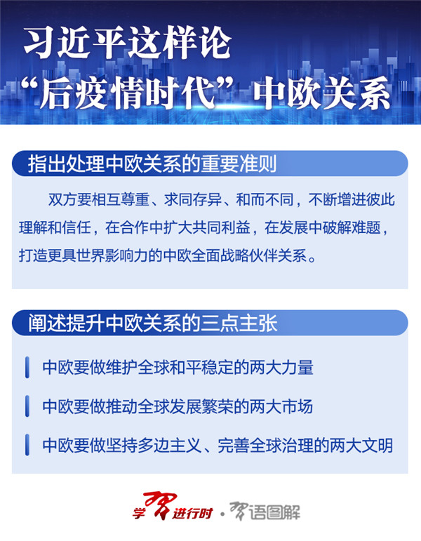22日,習(xí)近平以視頻方式會見歐洲理事會主席米歇爾和歐盟委員會主席馮德萊恩時,提出中歐“要做維護全球和平穩(wěn)定的兩大力量”“要做推動全球發(fā)展繁榮的兩大市場”“要做堅持多邊主義、完善全球治理的兩大文明”三點重要主張,為推動“后疫情時代”中歐關(guān)系在合作中擴大共同利益指明了方向。