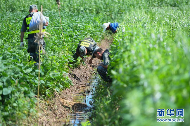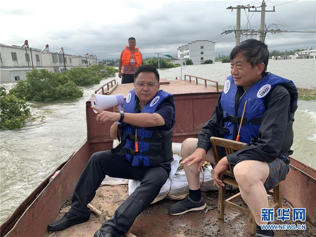 7月15日,安徽省宿松縣洲頭鄉(xiāng)黨委書記唐志華(左)在查看泗洲村受災(zāi)情況。 新華社發(fā)