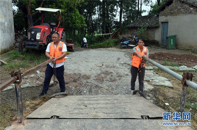 7月20日,在安徽安慶市??阪?zhèn),王啟干的兒子王為民(左)和兒媳王君彥(右)在幫忙啟動渡船。 新華社記者 周牧 攝