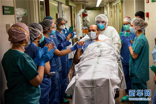 5月7日,在西班牙巴塞羅那的一家醫(yī)院,一名新冠患者在離開重癥監(jiān)護(hù)室前和醫(yī)護(hù)人員握手致意。 新華社發(fā)(弗朗西斯科·阿維亞攝)