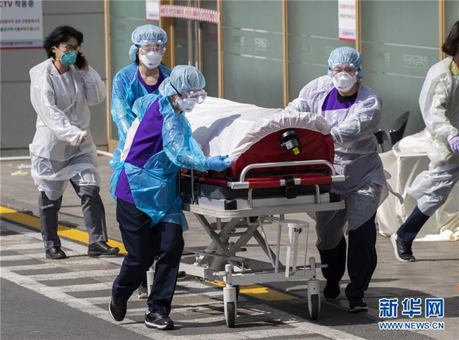 3月4日,在韓國大邱慶北大學(xué)醫(yī)院,醫(yī)護(hù)人員轉(zhuǎn)送患者。 新華社發(fā)(李相浩攝)