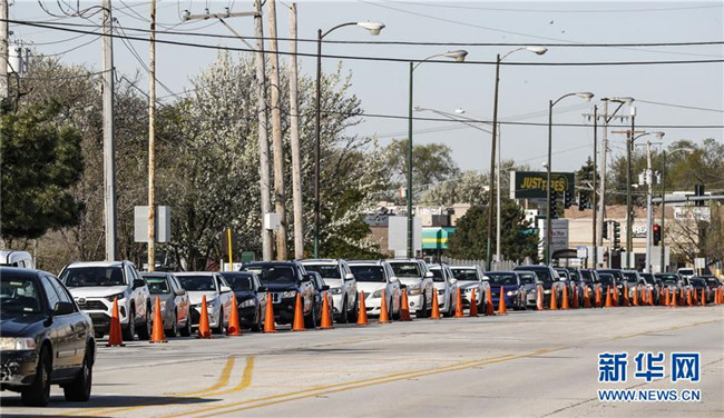 5月6日,在美國伊利諾伊州芝加哥西北部一處新冠病毒檢測點(diǎn),人們駕車排起長隊(duì)等待檢測。 新華社發(fā)(喬爾·萊納攝)