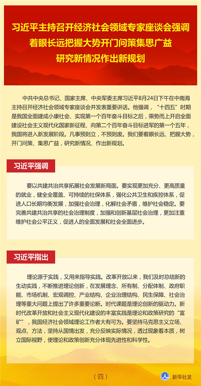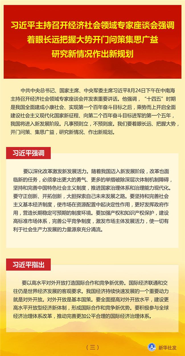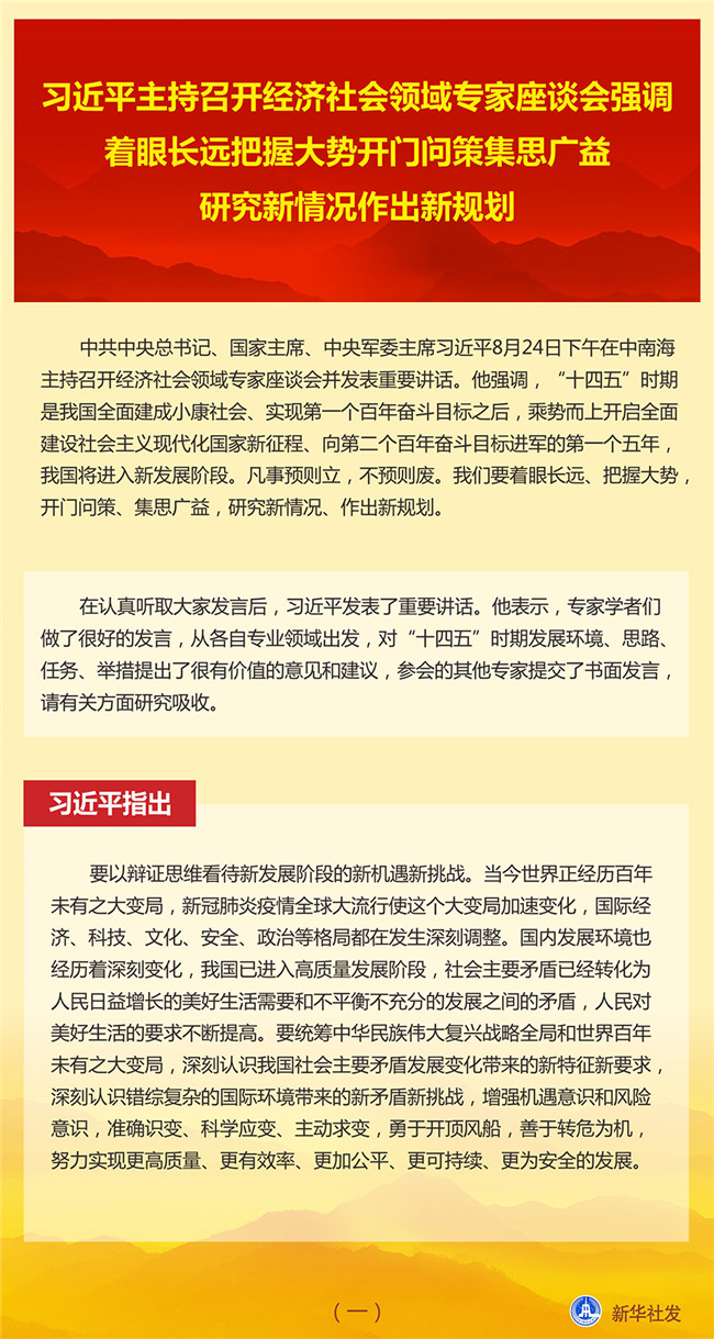 中共中央總書(shū)記、國(guó)家主席、中央軍委主席習(xí)近平8月24日下午在中南海主持召開(kāi)經(jīng)濟(jì)社會(huì)領(lǐng)域?qū)<易剷?huì)并發(fā)表重要講話。他強(qiáng)調(diào),“十四五”時(shí)期是我國(guó)全面建成小康社會(huì)、實(shí)現(xiàn)第一個(gè)百年奮斗目標(biāo)之后,乘勢(shì)而上開(kāi)啟全面建設(shè)社會(huì)主義現(xiàn)代化國(guó)家新征程、向第二個(gè)百年奮斗目標(biāo)進(jìn)軍的第一個(gè)五年,我國(guó)將進(jìn)入新發(fā)展階段。凡事預(yù)則立,不預(yù)則廢。我們要著眼長(zhǎng)遠(yuǎn)、把握大勢(shì),開(kāi)門(mén)問(wèn)策、集思廣益,研究新情況、作出新規(guī)劃。