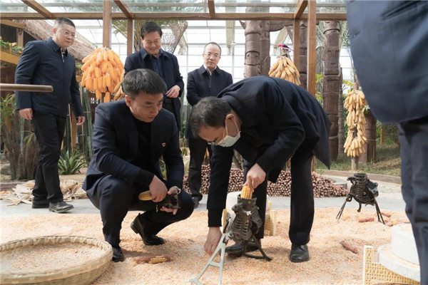 在上古農(nóng)耕文化、現(xiàn)代農(nóng)業(yè)科技與地方特色農(nóng)業(yè)相結(jié)合的神農(nóng)百草園里,高廳長饒有興趣的親自體驗農(nóng)事活動的玉米脫粒。調(diào)研組一行還參觀了各項高科技栽培種植及研學(xué)課堂區(qū)域。