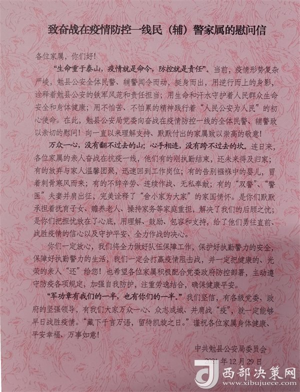 西部決策網(wǎng)訊為表達(dá)對(duì)奮戰(zhàn)在疫情防控一線民輔警家屬的崇高敬意,感謝他們對(duì)公安工作的理解和支持,12月29日下午,勉縣公安局組織開展疫情防控一線民輔警家屬慰問(wèn)活動(dòng),為家屬們送去慰問(wèn)信和慰問(wèn)品,并通過(guò)他們向奮戰(zhàn)在一線的民輔警傳遞勉縣公安局黨委的溫暖和關(guān)愛,以更加飽滿的熱情、昂揚(yáng)的斗志投入到疫情防控工作中。