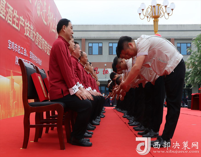大賽儀式上,西鳳集團(tuán)舉行了2022年師帶徒活動(dòng)拜師儀式,32名新老基酒一線職工結(jié)成16對(duì)“師徒”對(duì)子。以徒弟敬“連心酒”,師傅贈(zèng)送《西鳳酒文化瑰寶》,師徒共誦《弟子表》的形式完成了拜師禮,正式結(jié)為師徒。在今后的工作中這些師徒將共同奮戰(zhàn)在生產(chǎn)一線,師帶徒、徒幫師,將古老的制曲制酒工藝代代傳承。