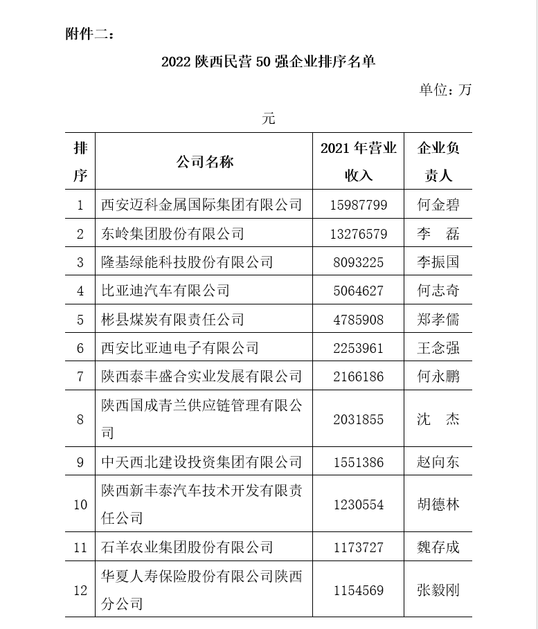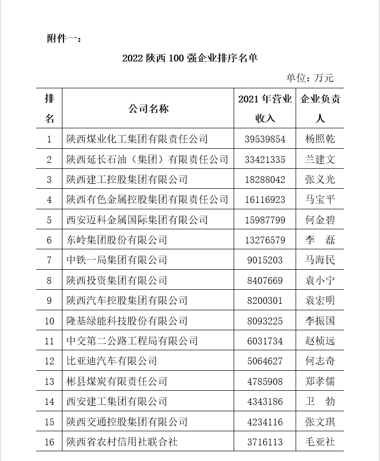西部決策網訊 12月18日,陜西省企業(yè)家協(xié)會發(fā)布了2022陜西100強企業(yè)和2022陜西民營50強企業(yè)榜單。(具體名單見附件一、二)