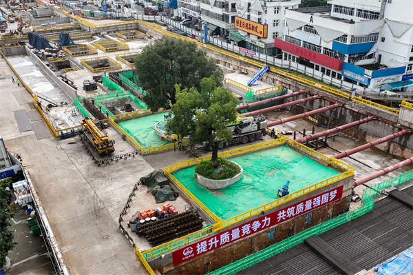 2株古樹(shù)采用原址保護(hù)方式,古樹(shù)下車(chē)站保留站廳層,古樹(shù)保護(hù)區(qū)域由技術(shù)術(shù)語(yǔ)叫作環(huán)板逆做法變更為暗挖法施工。