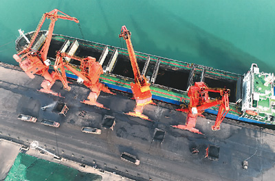 連日來(lái),江蘇連云港港加快冬季電煤運(yùn)輸和儲(chǔ)備,全力保障發(fā)電企業(yè)供暖用煤需求。圖為11月22日,貨輪在連云港港煤炭碼頭卸載電煤。王春攝(人民視覺(jué))